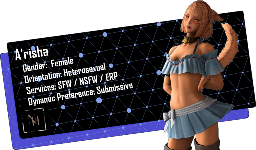 Sailing from a faraway land as she left her old life as a woman of the A tribe, A'risha kept traveling the world and decided to settle in Eorzia for her reasons.Her submissive nature may be overwhelmed by her sarcastic and sometimes rebellious attitude as she warms on to the people around her. She hates disappointing people who rely on her.Never shying away from experiencing new things, she loves to explore her options at every given opportunity.As a newcomer to the scene, she is now experiencing the life of a dancer at Night Haven.
